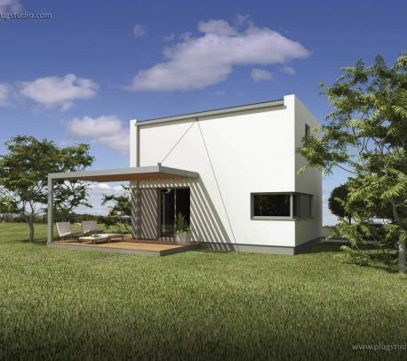 PS-OO-35-20-V02 to projekt małego domku jednorodzinnego. Budynek o niewielkich rozmiarach i konstrukcji szkieletowej. Zaprojektowany dla osób chcących zbudować niewielki dom małymi kosztami. Dostępna jest także wersja budynku parterowego - wtedy nie potrzeba pozwolenia na budowę i można budować na zgłoszenie jako budynek gospodarczy.