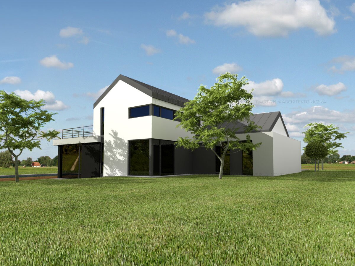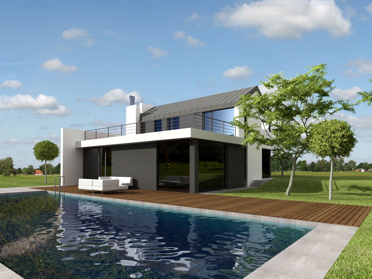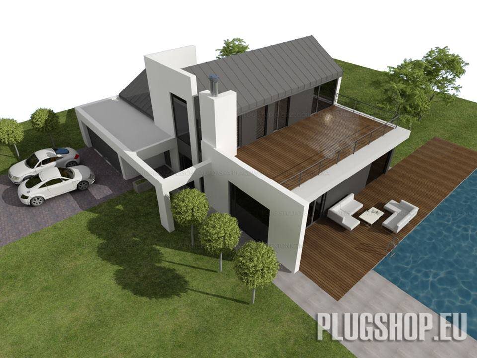 Projekt domu jednorodzinnego z ukrytym spadzistym dachem. Autor: Grzegorz Olesch Plug Studio Wizualizacje: Rzuty: