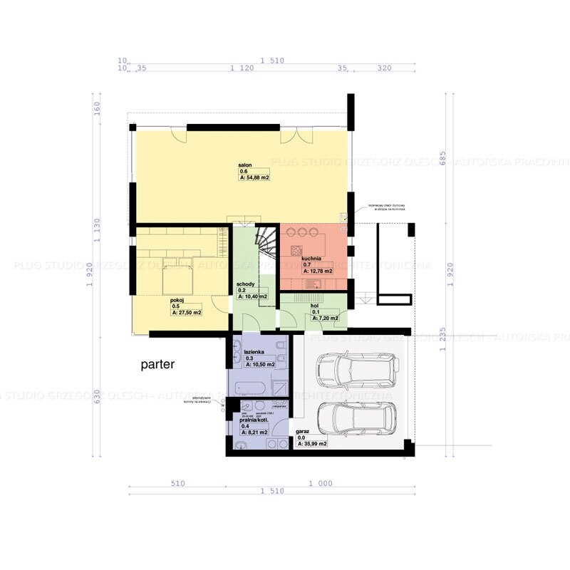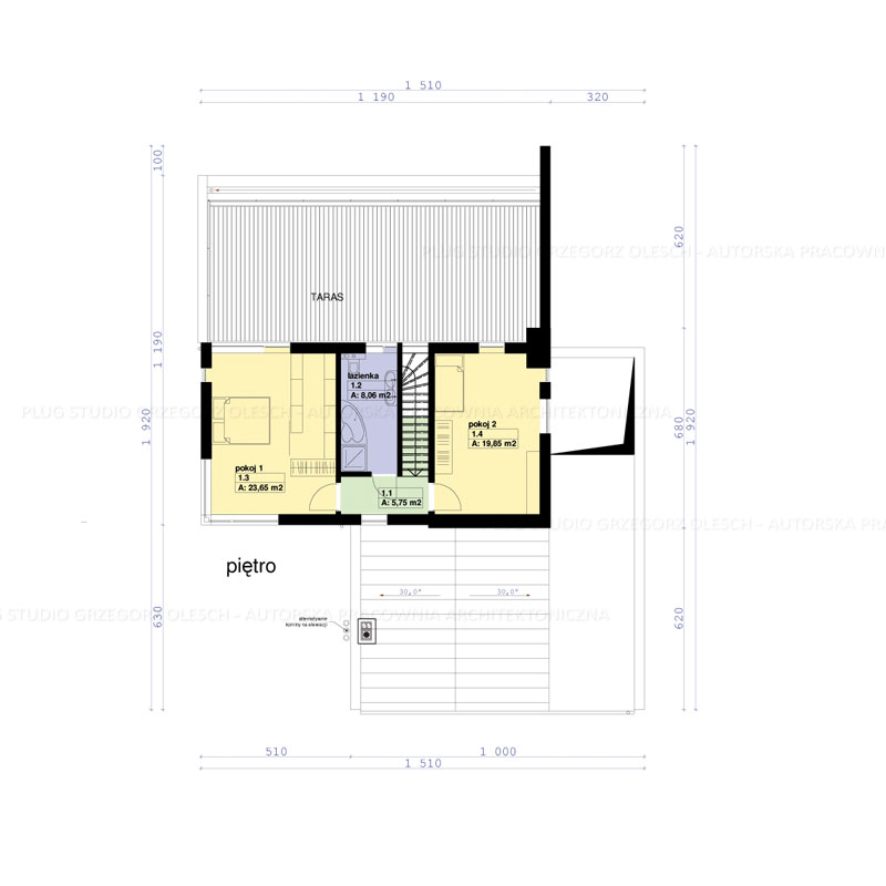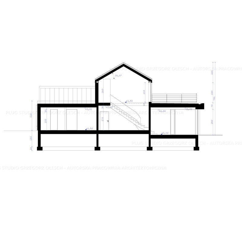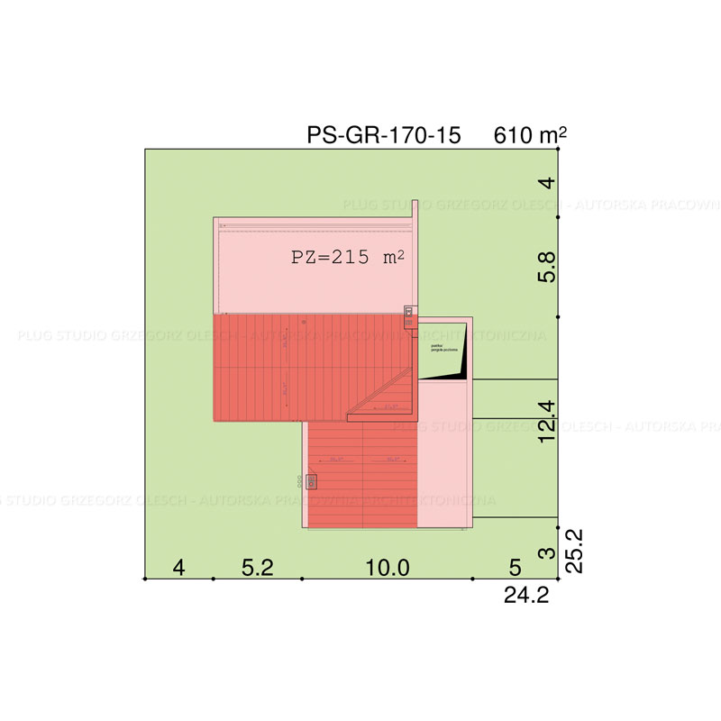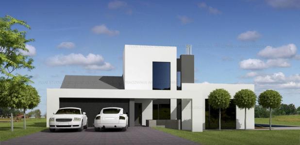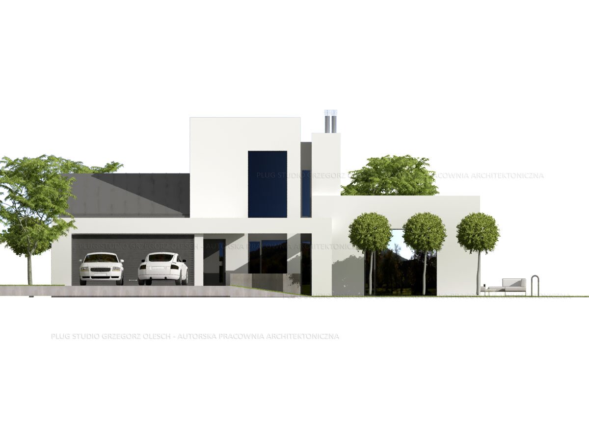 Projekt domu jednorodzinnego z ukrytym spadzistym dachem. Autor: Grzegorz Olesch Plug Studio Wizualizacje: Rzuty:
